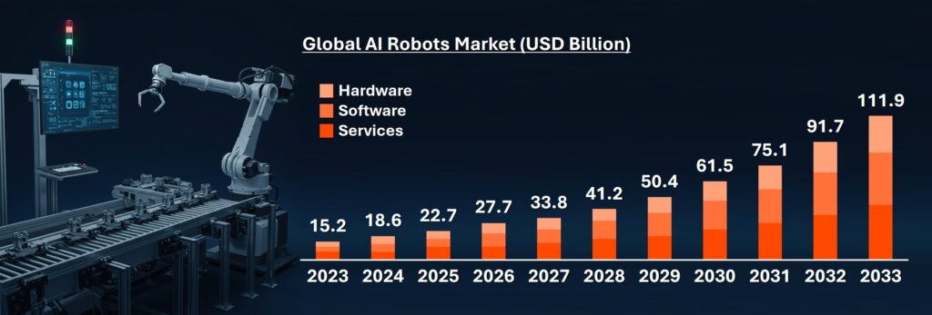 시장 조사 기관 Market.us에 따르면 글로벌 AI 로봇 시장은 2023년 약 152억 달러에서 연평균 성장률 22.1%를 기록하며 2033년까지 약 1119억 달러 규모에 이를 것으로 예측됩니다. 또한 Markets and Markets는 로봇 비전 시장이 2025년 약 33억 달러에서 2030년 약 50억 달러 규모로 성장할 것으로 내다봤습니다.